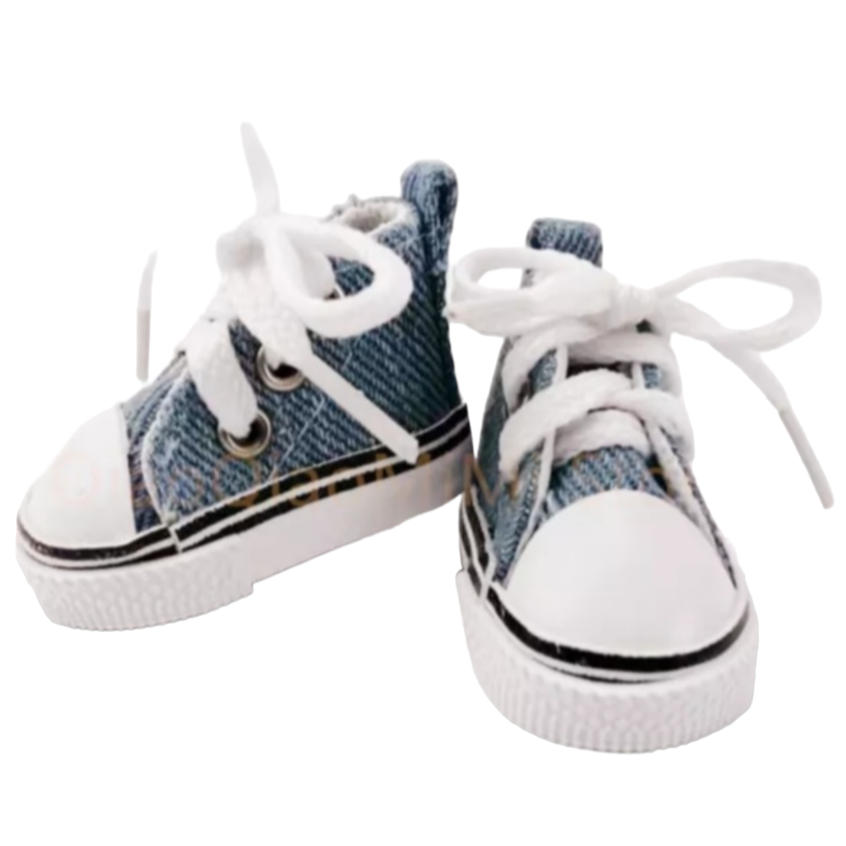 Baskets pour poupée en tissu et semelle en caoutchouc.Taille de la semelle : 5 cm de long. Gogolandie