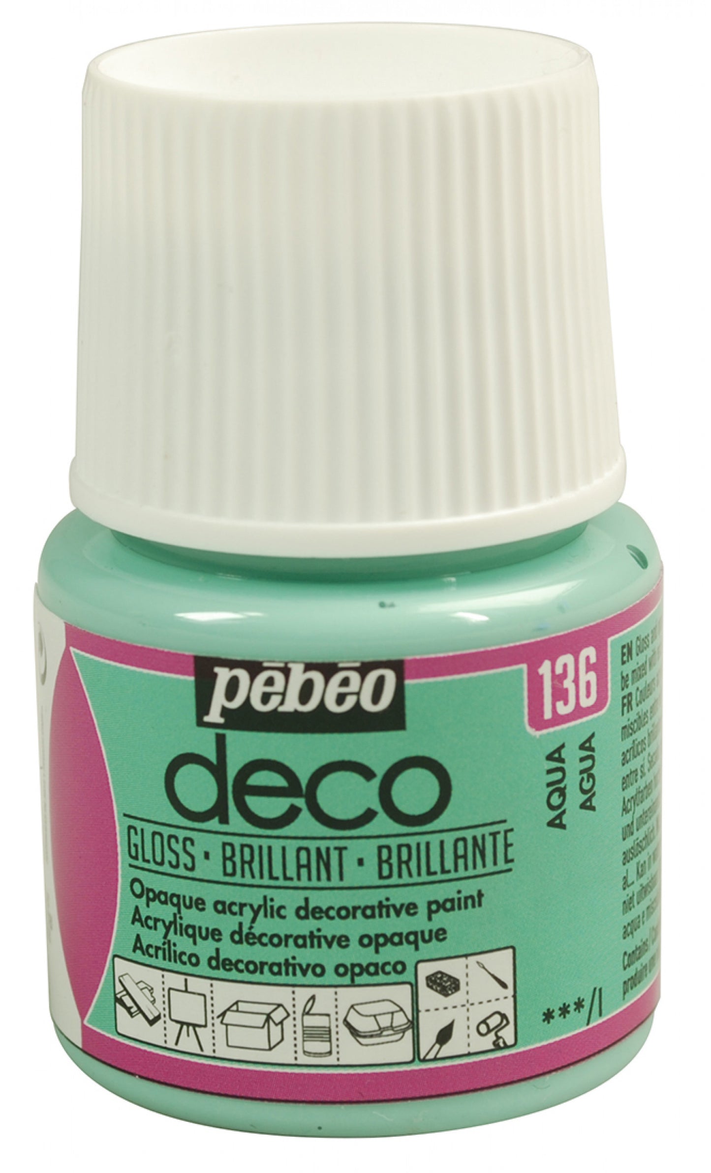 Pebeo Decò Brillant è una pittura acrilica fluida, pigmentata, brillante e permanente, per decorazioni multisupporto. Ideale su legno, gesso, terracotta, metallo, pasta di sale, cartone, pietra, carta, cemento, polistirolo.