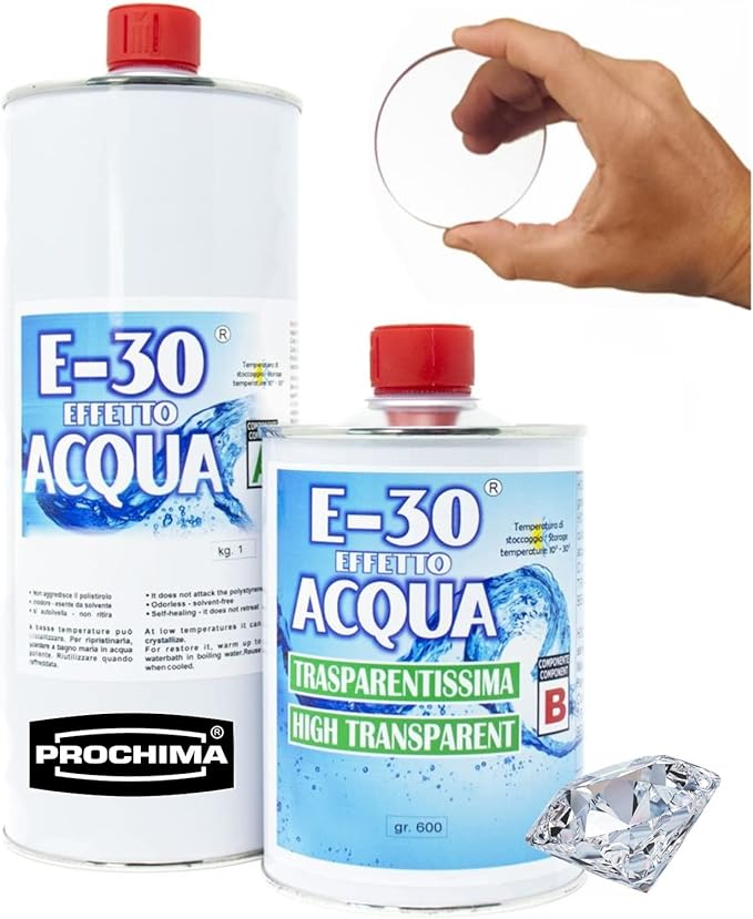 Resina Prochima E30 Effetto Acqua. Caratteristica principale di questo formulato è l’elevata trasparenza dei suoi componenti. Viene impiegato nel settore artistico, nell’artigianato e nel modellismo, per realizzare colate trasparenti di spessore anche elevato, per l’inglobamento di oggetti, o ottenere l’effetto acqua. Viene inoltre utilizzato nell’industria della bigiotteria nell’imitazione degli smalti vetrosi.