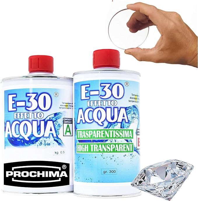 Resina Prochima E30 Effetto Acqua. Caratteristica principale di questo formulato è l’elevata trasparenza dei suoi componenti. Viene impiegato nel settore artistico, nell’artigianato e nel modellismo, per realizzare colate trasparenti di spessore anche elevato, per l’inglobamento di oggetti, o ottenere l’effetto acqua. Viene inoltre utilizzato nell’industria della bigiotteria nell’imitazione degli smalti vetrosi.