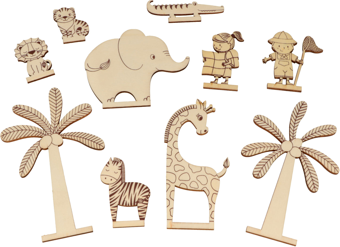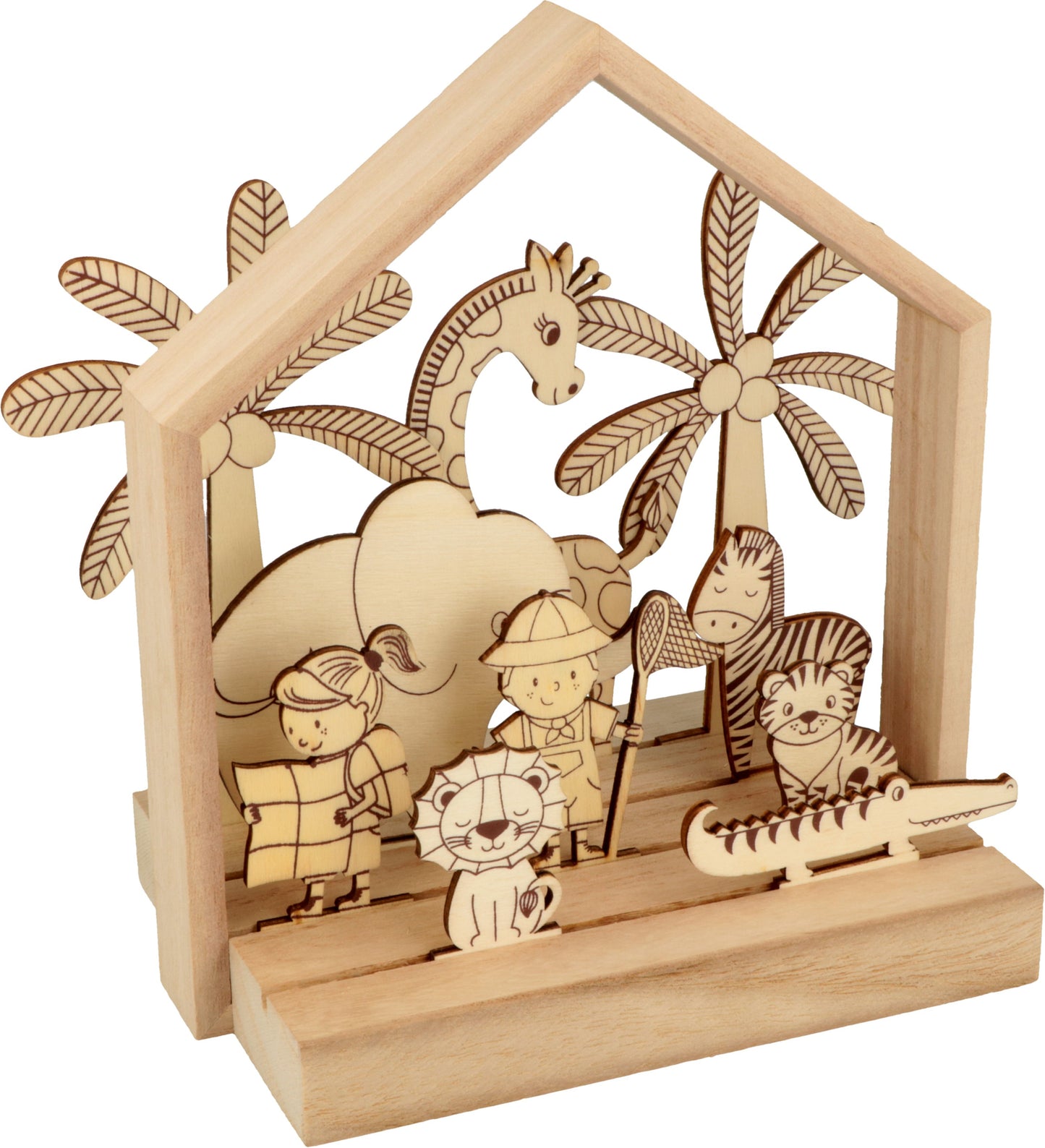 Kit legno 12 pezzi e 6 matite acquarellabili per realizzare la decorazione in legno 3D della Savana misura 18x16x11cm. Artemio