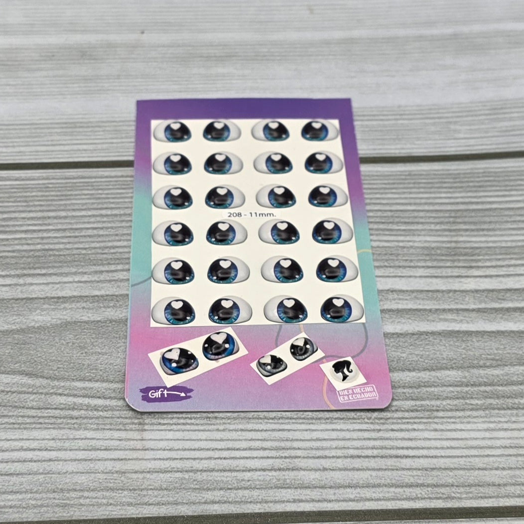 Occhi adesivi resinati 3D misura occhio larghezza 11mm alto 9,3mm. Confezione da 12 paia. Gogolandia
