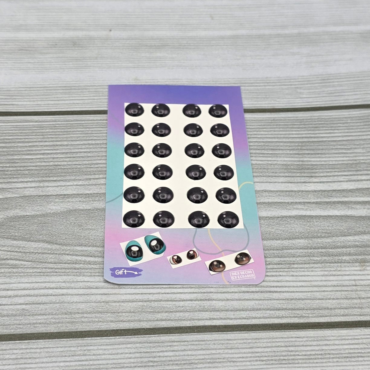 Occhi adesivi resinati 3D misura occhio larghezza 9mm alto 9mm. Confezione da 12 paia. Gogolandia