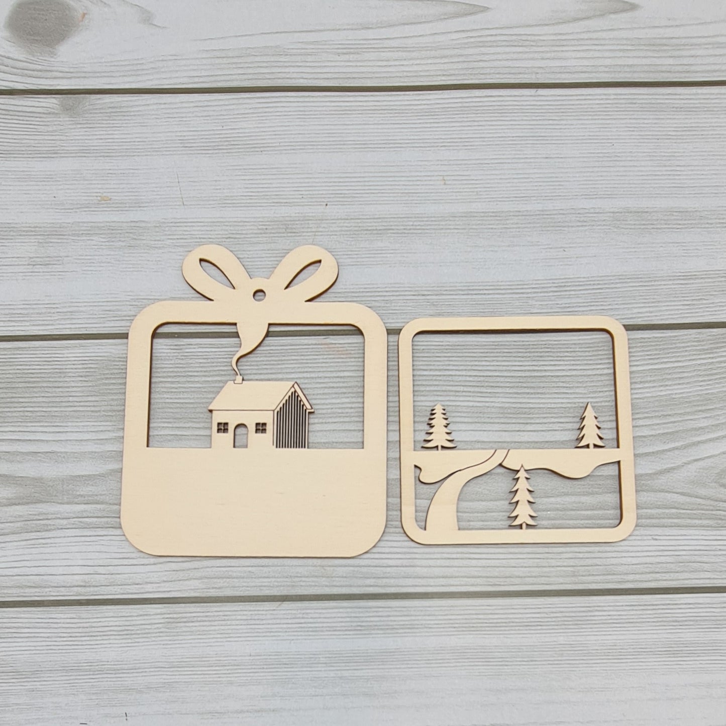 Pacchetto regalo con Villaggio in legno a rilievo, misura 13,5x11cm. Artemio