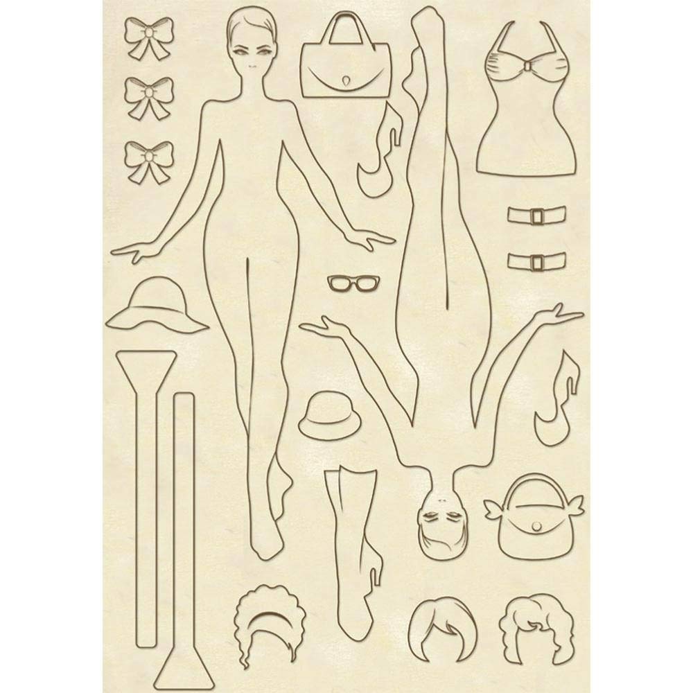 Decorazioni in legno Wilma Doll. Confezione come da foto misura 21x15 cm. Stamperia