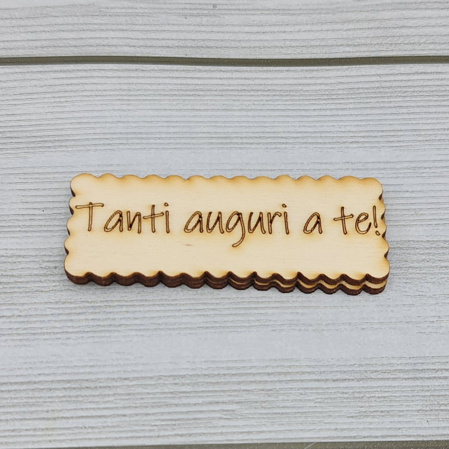 Targhetta Tanti Auguri a te in legno 8x3cm. Sagomiamo