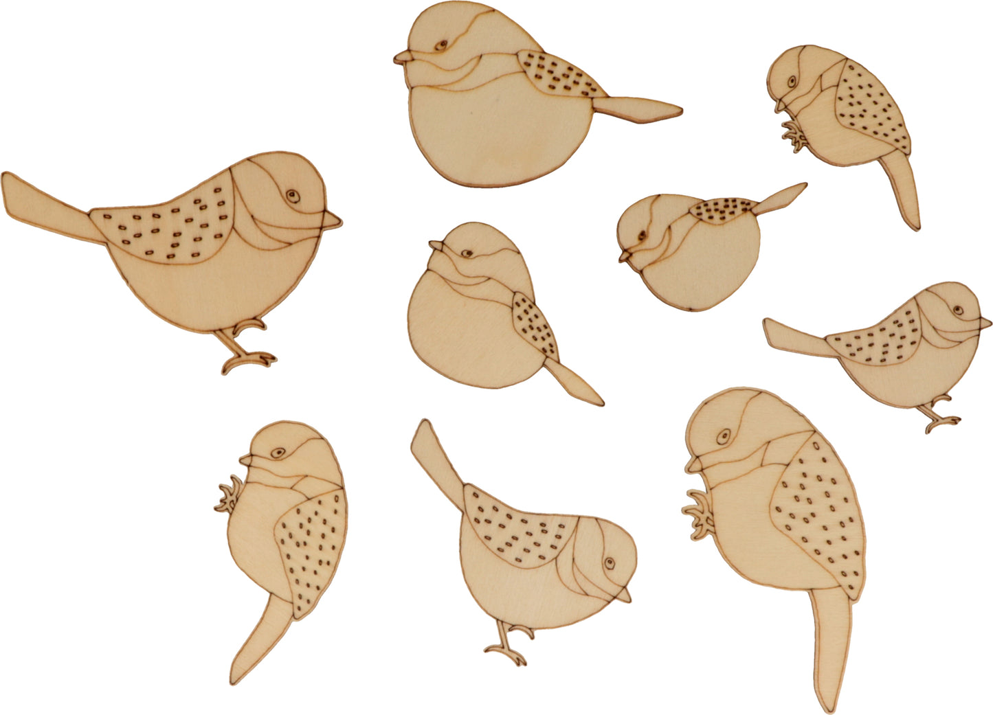 Set 18pz uccellini in legno come da foto. Misura da 4 a 7 cm. Artemio